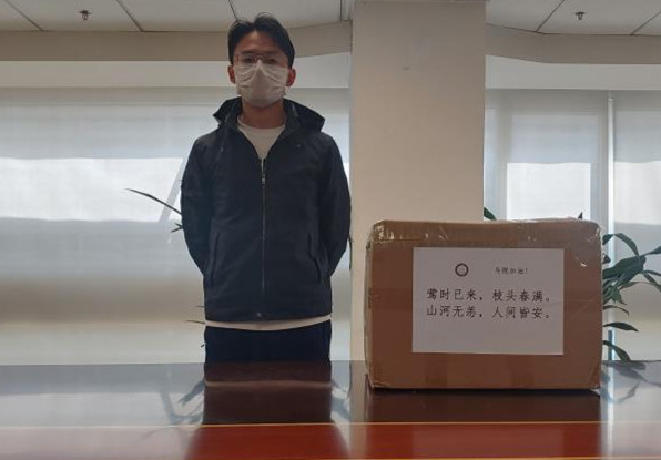 2019级研究生孟伟斌同学,在力所能及范围内、主动为公司捐献一些口罩,并邮寄到公司。贴有“莺时已来,枝头春满。山河无恙,人家皆安”的口罩物资箱,不仅充实了公司防疫物资储备,更温暖了所有马院人的心,体现了一名学子对公司热爱和抗疫热忱。