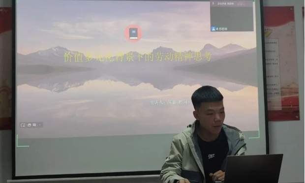 本次讲座由2021级马克思主义理论专业郝鑫同学主讲。郝鑫同学主要围绕四个方面内容进行讲述。首先,郝鑫同学从文化逻辑、理论逻辑、历史逻辑、实践逻辑四个方面解释了劳动精神的形成逻辑。其次,从“经济全球化带来的影响”、“现代科学技术应用”两方面阐述了价值多元化产生的原因,以及从享乐主义、拜金主义、功利主义等方面介绍了价值多元化的表现。然后,郝鑫讲到提倡劳动精神,是培养高尚道德情操的要求、是全面建设社会主义现代化国家的需要、是贯彻落实以人民为中心的重要支撑、是培育社会主义事业接班人的举措。最后,郝鑫同学提出培育劳动精神的方法, 一是要从思想方面培育,二是从制度上鼓励、引导和支持,三是任何理论不能脱离实践,理论来源于实践,最终落脚点还是实践,所以我们要通过各种方法推行劳动精神的培育。