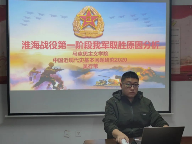 本次讲座由2020级中国近现代史基本问题研究专业的吴行苇同学主讲。吴行苇同学首先讲解了淮海战役第一阶段的总述。淮海战役第一阶段的主战场位于碾庄,在此战役中我军歼灭国民党黄百韬兵团,取得了巨大的战果,但也付出了巨大的牺牲,但正是这场战役的伟大胜利,为我军取得淮海战役的全面胜利奠定了基础。其次,他讲述了战前我军取胜的因素,主要是我军高层对此次战役做出正确的战略决定。此外,他介绍了追堵阶段我军取胜的原因,我军在济南战役后较快完成休整和对淮海战役的战略部署,给敌军以突然袭击。但黄百韬兵团在撤退过程中犹豫不决、混乱无序,最终我军官兵不怕疲劳,凝心聚力成功将黄百韬兵团包围。最后他阐述了围歼阶段我军取胜的原因,我军分工明确,采取运动战和阵地战相结合的战术集中最优势兵力对黄百韬兵团进行围攻,同时杜聿明、邱清泉、李弥基于派系斗争消极增援,进一步使得我军胜利歼灭黄百韬兵团。