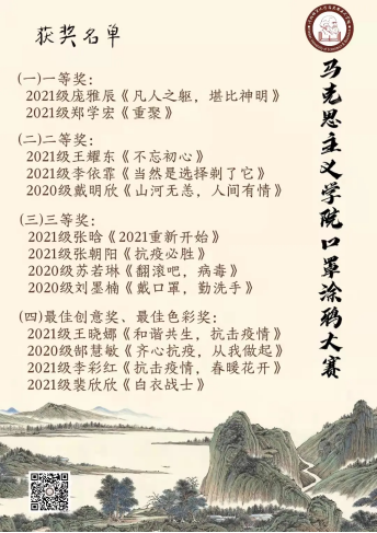 本次活动共分为两个阶段。前期通过线上投票的方式,对47位同学的参赛作品进行了评选,经过为期两天的激烈角逐,15个优秀作品进入了本次活动的决赛。后期决赛共分为三个环节。首先,此前的线上投票中脱颖而出的15名同学,依次对自己作品的立意做了详细讲解,并由同学们进行了投票。然后,在“你画我猜”环节中,每位参赛选手在规定时间内画出指定的内容,并交由同学们进行猜测,被猜中的越多即可获得越高的分数。最后,根据线上投票、口罩立意讲解投票以及“你画我猜”环节得分,评选出本次活动的各种奖项。