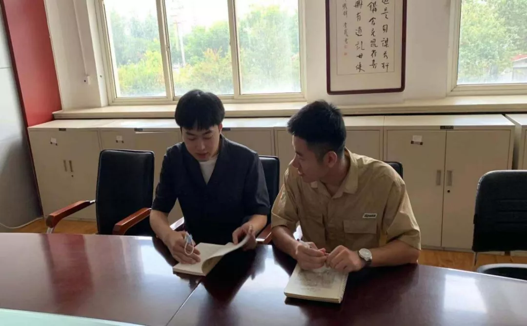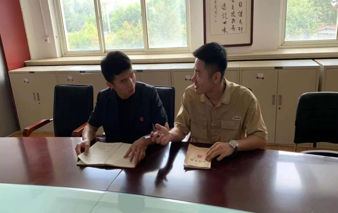 图为刘英浩同法院工作人员程宽进行交流(中国青年网通讯员 刘子旸 摄)