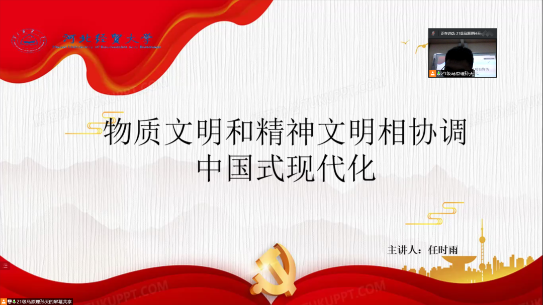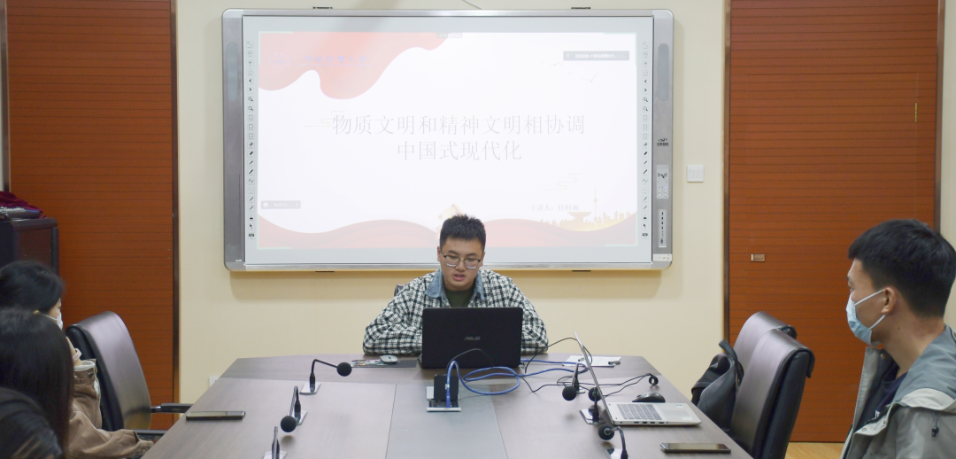 任时雨同学主讲的题目为《物质文明和精神文明相协调的中国式现代化》。该同学的主讲内容分为三个部分:第一部分强调了我党历来重视物质文明和精神文明协调发展。第二部分介绍了我国目前存在的物质文明和精神文明发展不平衡的状况,主要表现在我国物质财富快速增长的同时,精神文化生活比较贫乏,人们文明素质和社会文明程度有待提高。第三部分提出了要重点加强精神文明建设的三条有效措施,即培育和践行社会主义核心价值观,增强文化自觉、坚定文化自信,推动中华优秀传统文化创新性发展和创造性转化。