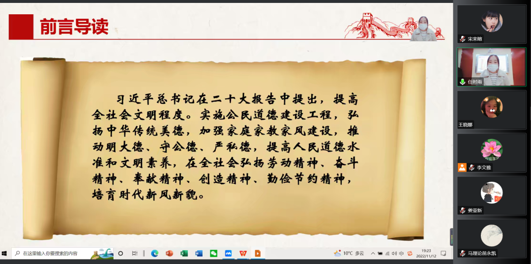李彩红同学主讲的题目为《提高全社会文明程度的几点思考》。她从党的二十大报告中关于提高全社会文明程度的原文引入,分三个部分进行了主讲。第一部分讲解了在推进新时代公民道德建设时要如何处理好“知”与“行”的关系,以及推进新时代公民道德建设的四种方式,即推进马克思主义理论研究和建设工程、大力开展道德模范和先进典型评选推荐活动、强化理想信念教育、加强公民道德建设宣传等;第二部分介绍了加强家庭家教家风建设的相关政策和活动,并具体介绍了加强家庭家教家风建设的三种方式,包括完善保证制度、加强家庭伦理教育、开展文化实践活动等;第三部分提出了推进城乡文明建设融合发展的三条措施,即要面向城乡基层扎实推进文明实践、以科学化制度化巩固拓展文明创建工程、不断丰富和改善人民群众精神文化生活。