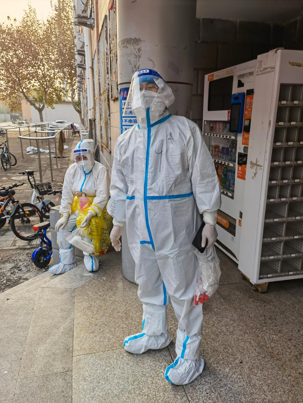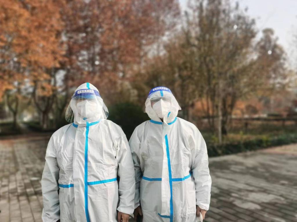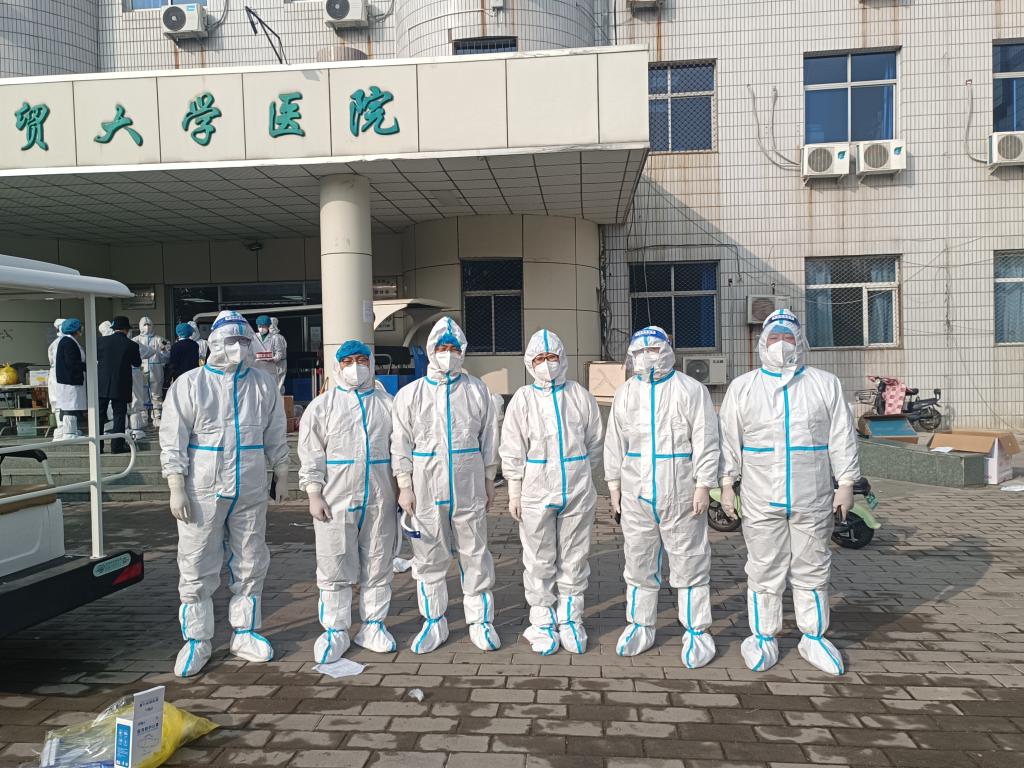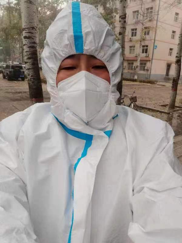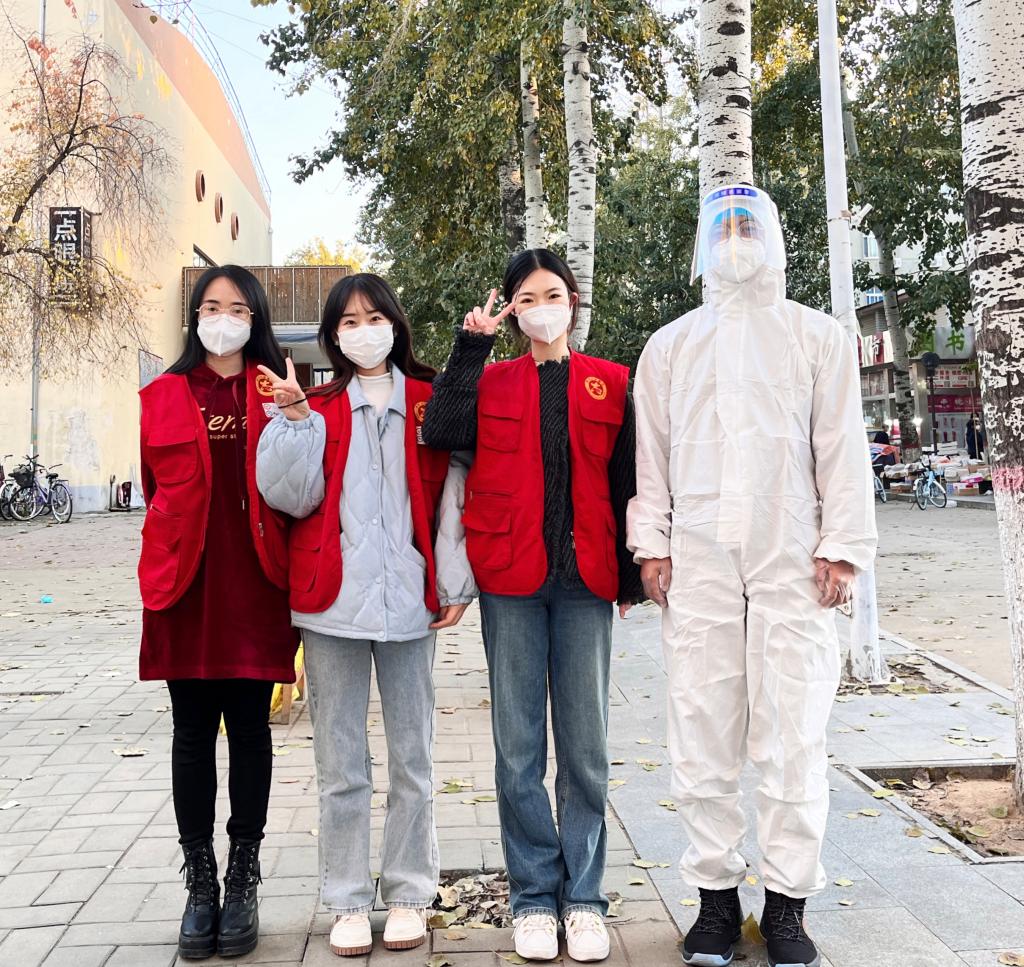 “抗击疫情,马院老师们服从公司党委统一领导指挥,冲锋抗疫志愿者队伍一线,赵志浩、赵立永、李雪飞、尼莎和我做‘大白’负责采集核酸信息,马鑫、周献术、董越深入员工宿舍做楼层长。危急时刻,在校每一位老师都挺身而出,守护经贸莘莘学子。经贸加油,战疫必胜,共克时艰。”