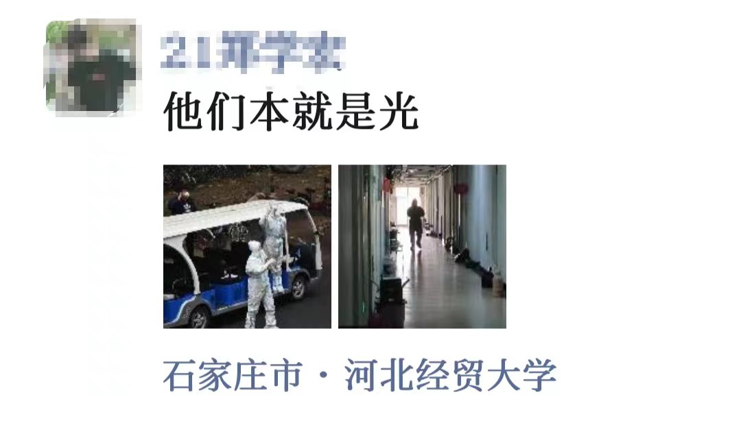 疫情就是命令,防控就是责任。在志愿服务中我体会到医护工作者、老师们的辛苦,同时也看到同学们积极配合公司的工作,乐观向上的心态。“上下同欲者胜,同舟共济者赢”,相信党,相信组织。在大家共同努力下,一定可以战胜疫情。共克“石”艰!经贸加油!经贸必胜!——2021级班长、网格长郝鑫