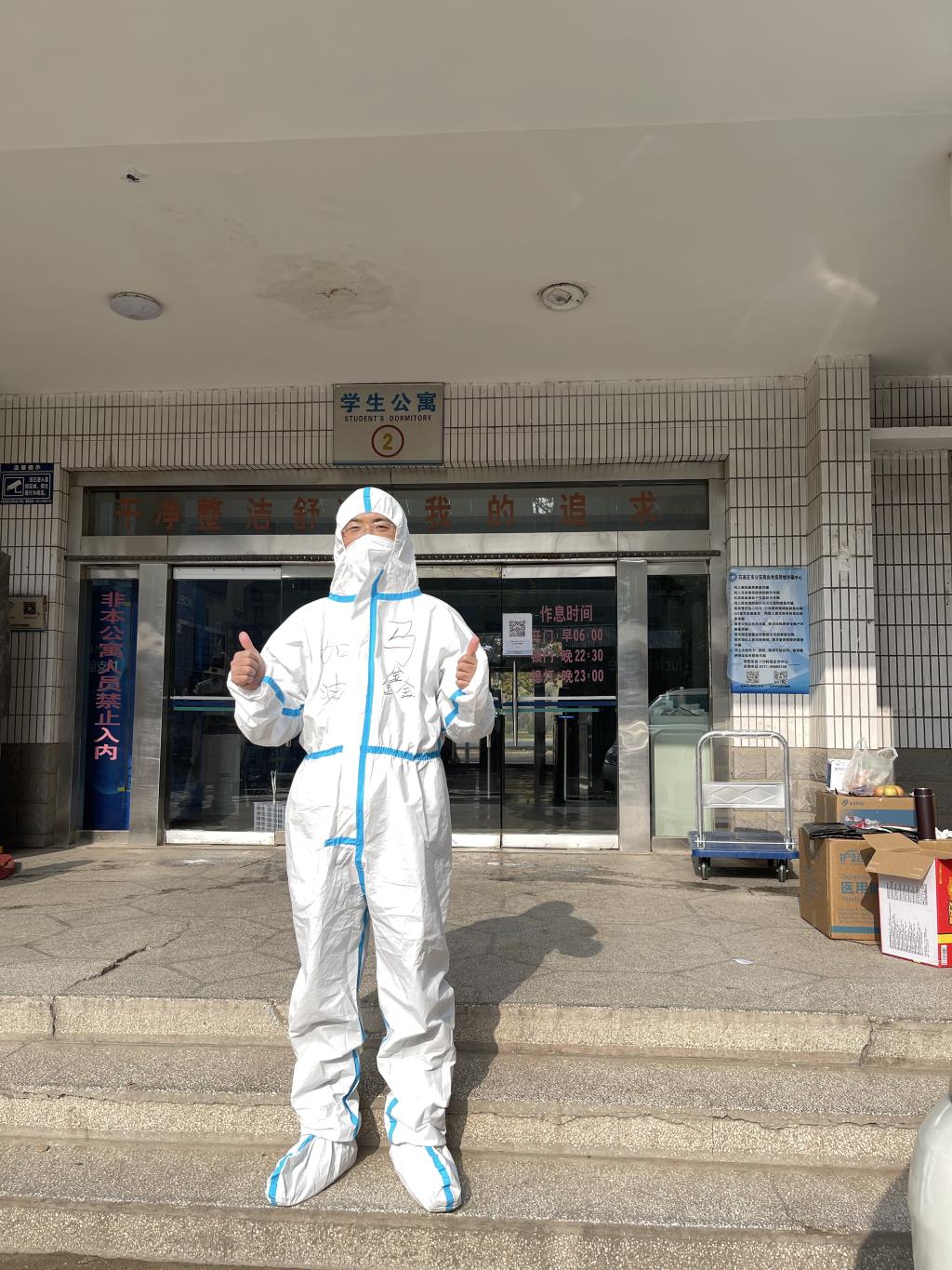“以前总觉得病毒离自己很远,没想到疫情突降周遭;以前无法体会‘大白’的辛苦,今天是真切地理解和感受到了他们的不容易;以前总觉得当志愿者很轻松,穿上防护服做上志愿者才真正明白当志愿者是一种责任和担当!虽然疫情正在肆虐校园,但我相信有我们全体经贸人的齐心协力,勠力同心,就一定能战胜疫情,早日驱散病毒阴翳!加油!经贸人!”