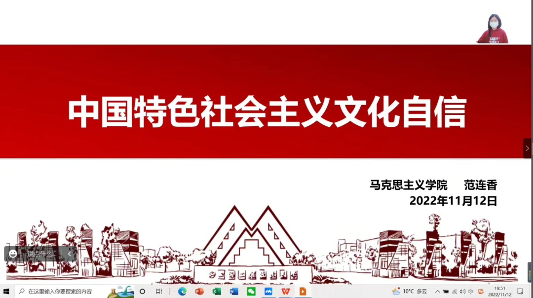 11月12日晚,公司研究生会学习贯彻党的二十大精神系列活动第二期在二办203举行。系列活动第二期以“推进文化自信自强,铸就社会主义文化新辉煌”为主题,共有四位主讲人参与主讲,第四讲主讲人为2022级马克思主义理论专业研究生范连香。本次活动采用线上线下相结合的方式,全院90余名研究生参加了此次活动。