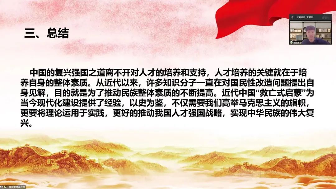 王耀东同学主讲的题目为《近代人才强国的历史研究》。王耀东同学首先解释了国民性的概念,并通过列举近代三位杰出学者的国民性相关语录,引出国民性的内涵并说明其重要性。然后,他从封建制度与国民性相互影响和传统思想与国民性相互作用两个方面来阐释近代以来我国国民性的变化历程。在封建制度方面,王耀东同学根据近代中国国民劣根性与封建制度具有共犯关系来解释我国近代国民性为何低下。在传统思想方面,他以中国的“天人合一”思想和西方的“天赋人权”观念作对比,说明传统思想在一定程度上阻碍了国民思想的革新。