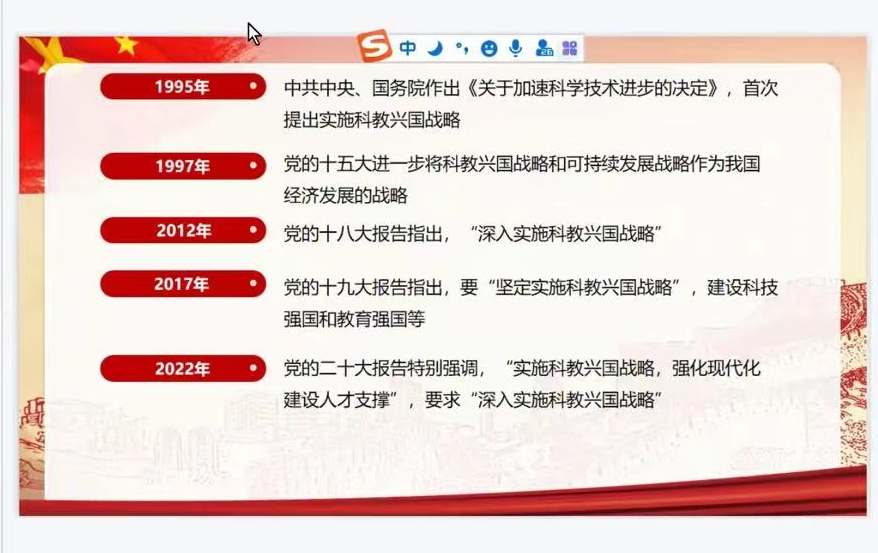 蔡亚荣同学主讲的题目为《以科教兴国战略助力中国式现代化》。党的二十大报告首次将教育、科技、人才作为一个整体进行论述,进一步理顺了建设教育强国、科技强国、人才强国的内在联系。唯有加快建设教育强国,才能为建设科技强国、人才强国涵养源头活水;唯有加快建设科技强国,才能充分释放科技这个“第一生产力”、激活创新这个“第一动力”;也唯有加快建设人才强国,才能为科技创新提供人力资源保障。实现中华民族伟大复兴,基础在于教育,党中央历来重视教育事业,在当今中国式现代化建设的历史征程中,教育的作用更加突出。只有推进教育公平,办好人民群众满意的教育,才能有力地推动中国式现代化实现。