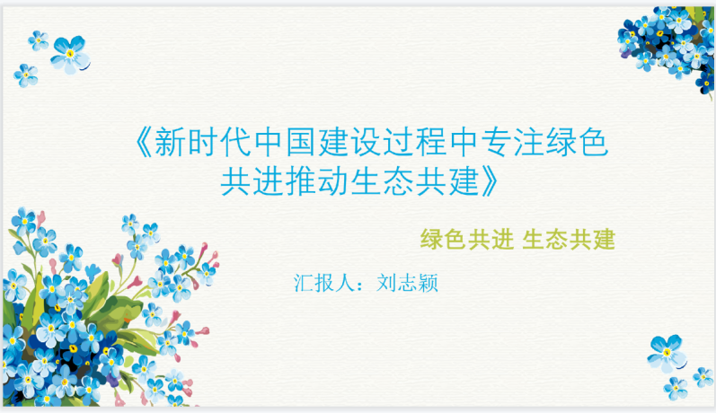 刘志颖同学主讲的题目为《新时代中国建设过程中专注绿色共进推动生态共建》。党的十八大以来,生态文明建设在党和国家事业发展全局中的地位显著提升。党的十八大首次把生态文明建设纳入中国特色社会主义事业“五位一体”总体布局。党的二十大报告中进一步指出,中国式现代化是人与自然和谐共生的现代化。坚持人与自然和谐共生不仅是中国式现代化道路的重要内容,也是人类文明新形态的重大成果。中国式现代化道路不同于西方,不以牺牲自然环境为代价去发展,而是强调坚持尊重自然、顺应自然、保护自然的基本原则,打破了西方现代化的工业文明价值取向,是对西方以资本为中心、先污染后治理的工业化现代化道路的批判与超越,为世界现代化模式多元发展提供了全新选择。