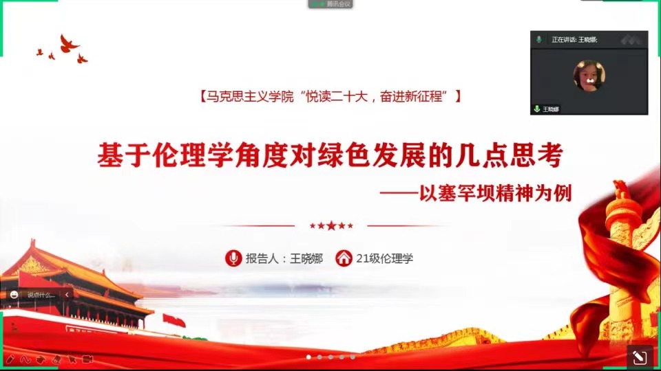 王晓娜同学主讲的题目为《基于伦理学角度对绿色发展的几点思考》。王晓娜同学以塞罕坝为例引出主题,分三个部分进行讲解。首先,王晓娜同学讲述了自人类诞生以来,人类与自然的关系经历了三个阶段。其次,以塞罕坝为例子,从绿色与效益两个角度解释了党的二十大报告中的“绿水青山就是金山银山”的理念。最后,生态公民是与生态文明建设相适应的主体承担者,是生态社会的建构者,生态精神的承载者和生态利益的维护者。我们要学习塞罕坝精神,做好生态公民。