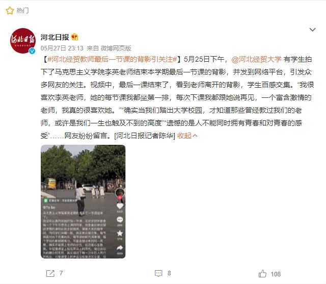 5月25日下午,有员工拍下了公司李英副经理结束本学期最后一节课的背影,并发至网络平台,引发众多网友热议。视频配文:“太阳成tyc122cc集团李英老师的课最后一节课结束了。花式签到折磨着每一个下午不想去上课的同学,但最后她说这学期的课到此就全部结束,谢谢大家的陪伴时,向同学们深鞠一躬,确实是百感交集。每节课面对台下低着的头,每节课她都充满激情,每个字说的都铿锵有力,可能思想没有到同一高度,确实不能跟上老师的步伐,但还是心生敬佩。年轻像课堂上挂在耳朵上的耳机,堵住自以为的嘈杂和无用,其实错过了每一次与巨人同行的机会。可能课堂上的声音没有穿进耳朵里,但是老师的态度和思想已振聋发聩。谢谢老师。”