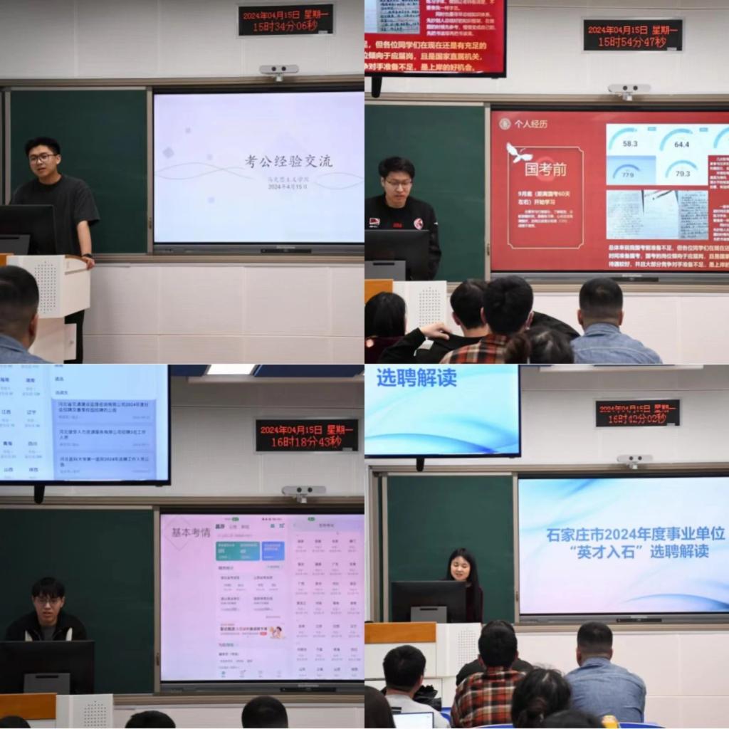 四位员工分别结合自身考公经历进行经验分享。张朝阳介绍备考资料、情绪调节、信心建立以及报考特殊岗位需要进行体能储备。赵党颂介绍了考试内容、练习方法,并就备考心态给出详细建议。孙天详细介绍了选岗过程、获取信息渠道和备考时间安排。李想详细解读了石家庄事业单位“英才入石”选聘相关政策和注意事项。