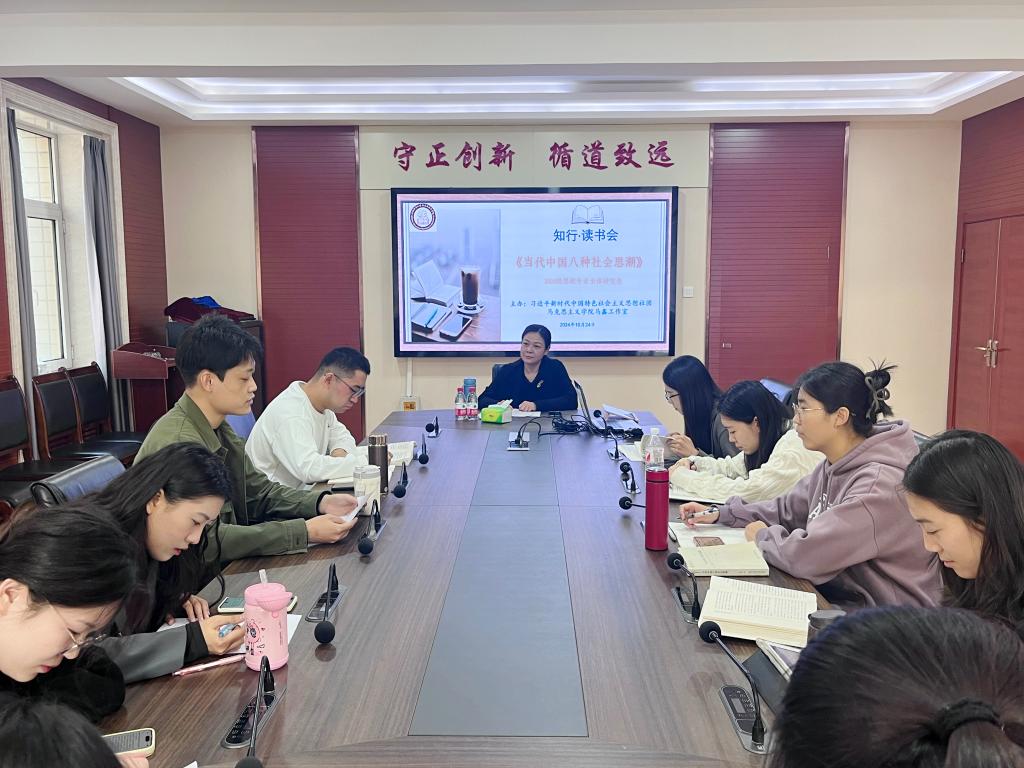 10月24日晚,公司在二办203室举办研究生“知行”读书系列分享会(第一期),会议由习近平新时代中国特色社会主义思想社团、第一党支部马鑫工作室主办。本次读书会聚焦《当代中国八种社会思潮》一书,邀请胡俊苗副教授作为评议人,2024级思想政治教育方向全体研究生参会讨论。