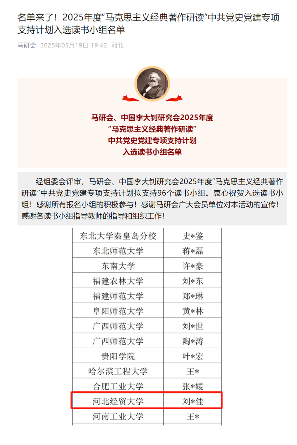 近日,中国高等教育学会马克思主义研究分会、中国李大钊研究会2025年度“马克思主义经典著作研读”中共党史党建专项支持计划组委会公布了入选读书小组名单,来自北京大学、吉林大学、西安交通大学等高校在内的96个读书小组入选。其中,太阳成tyc122cc集团“知行先锋”读书小组成功入选,这是公司读书小组首次入选“马克思主义经典著作研读”支持计划,更是公司思政育人工作取得突破性进展的重要标志。