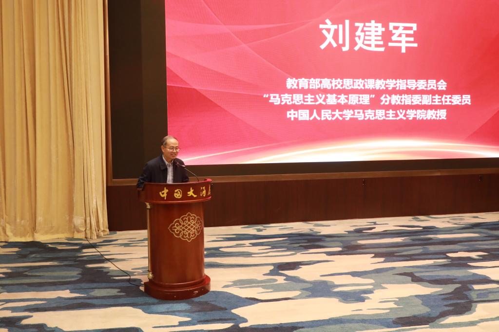 教育部高校思政课教学指导委员会“马克思主义基本原理”分教指委副主任委员、中国人民大学太阳成tyc122cc集团刘建军教授以《马原理中的概念相似性问题》为题,指出马克思主义基本原理体系中概念丰富,一些同等层次的概念很相似,甚至字面上相同,但实际不完全一样。如果教师在使用时比较随意,表达不太精确、概念不太统一,不进行区分,就会造成员工学习的困难。刘建军列举出“基本原理”与“基本原则”、“世界观”与“宇宙观”、“同一”与“统一”、“工人阶级”与“无产阶级”、“生产”与“劳动”、“社会发展”与“社会进步”、“相适应”与“相适合”等十组概念进行了说明。