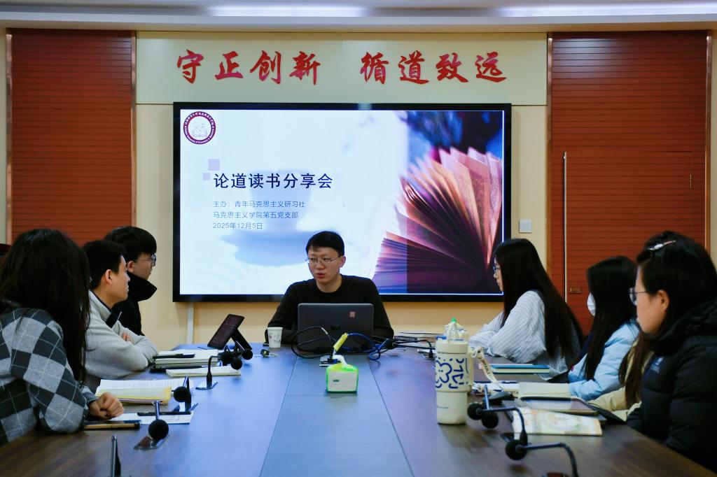 12月5日,公司在二办203举办研究生“论道”读书分享会(第五期),本次会议由青年马克思主义研习社、公司第五党支部主办。公司青年教师、硕士研究生导师梁若愚作为评议人,2025级中国近现代史基本问题研究方向全体研究生参与学习交流。