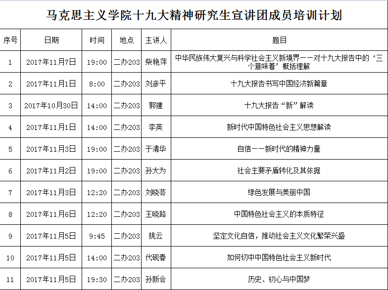 公司在员工积极报名的基础上,严格遴选优秀研究生组建了“十九大精神研究生宣讲团”。为了保证研究生宣讲质量,党总支书记、经理柴艳萍,副经理刘彦平、郭建、李英以及于清华、孙大为、刘晓芸、王晓路、姚云、代砚春、孙新会等11名教授、副教授、博士将先后对宣讲团成员进行专题培训,现将培训计划公布如下:
