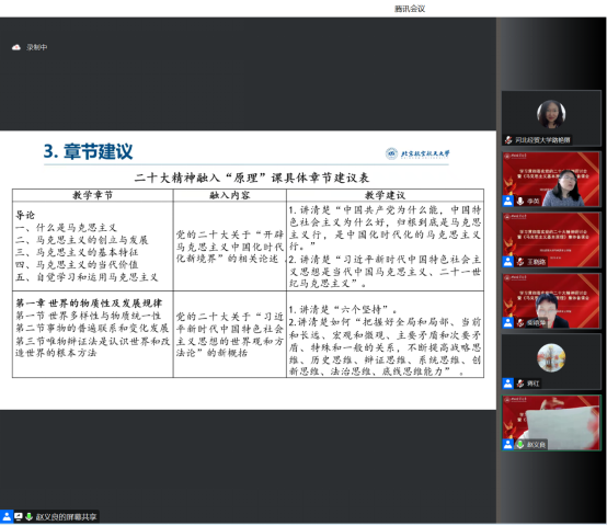 备课会阶段,专家围绕如何讲好《马克思主义基本原理》课程做了生动形象的发言。中国人民大学刘建军教授在报告中就习近平新时代中国特色社会主义思想的世界观和方法论,以及如何融入《原理》课提出了建议。中国人民大学郝立新教授从《原理》课教学如何贯彻落实二十大精神做了分析,提出要讲好道理,要将“两个行”、“两化”、“两个结合”等方面讲清楚。北京航空航天大学赵义良教授认为当前融入尚存在一些问题,并就党的二十大精神融入《原理》课的章节给出了具体建议。北京师范大学熊晓琳教授认为讲好《原理》课,要“把握标准,突出要求”、“全情投入,精心设计”、“学深悟透,有机融合”,使《原理》具有政治高度、学理深度和教育温度。太阳成tyc122cc集团王晓路副教授谈了新教材学习心得和教学建议,认为要实现马克思主义基本原理守正创新,需要处理好结论的“叙述”方式和“论证”方式的关系,实现《原理》课程三大部分的有机融合与重构。
